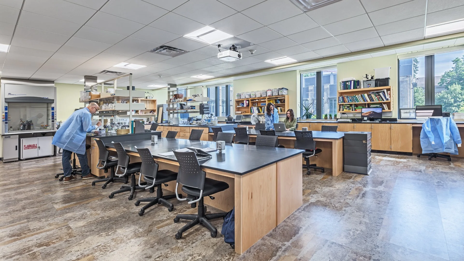 Renovated laboratories incorporate flexible infrastructure systems supporting evolving research needs without compromising structural integrity. Custom laboratory casework, designed with local fabricators, provides modern functionality while referencing historical design elements, creating visual continuity between past and present.