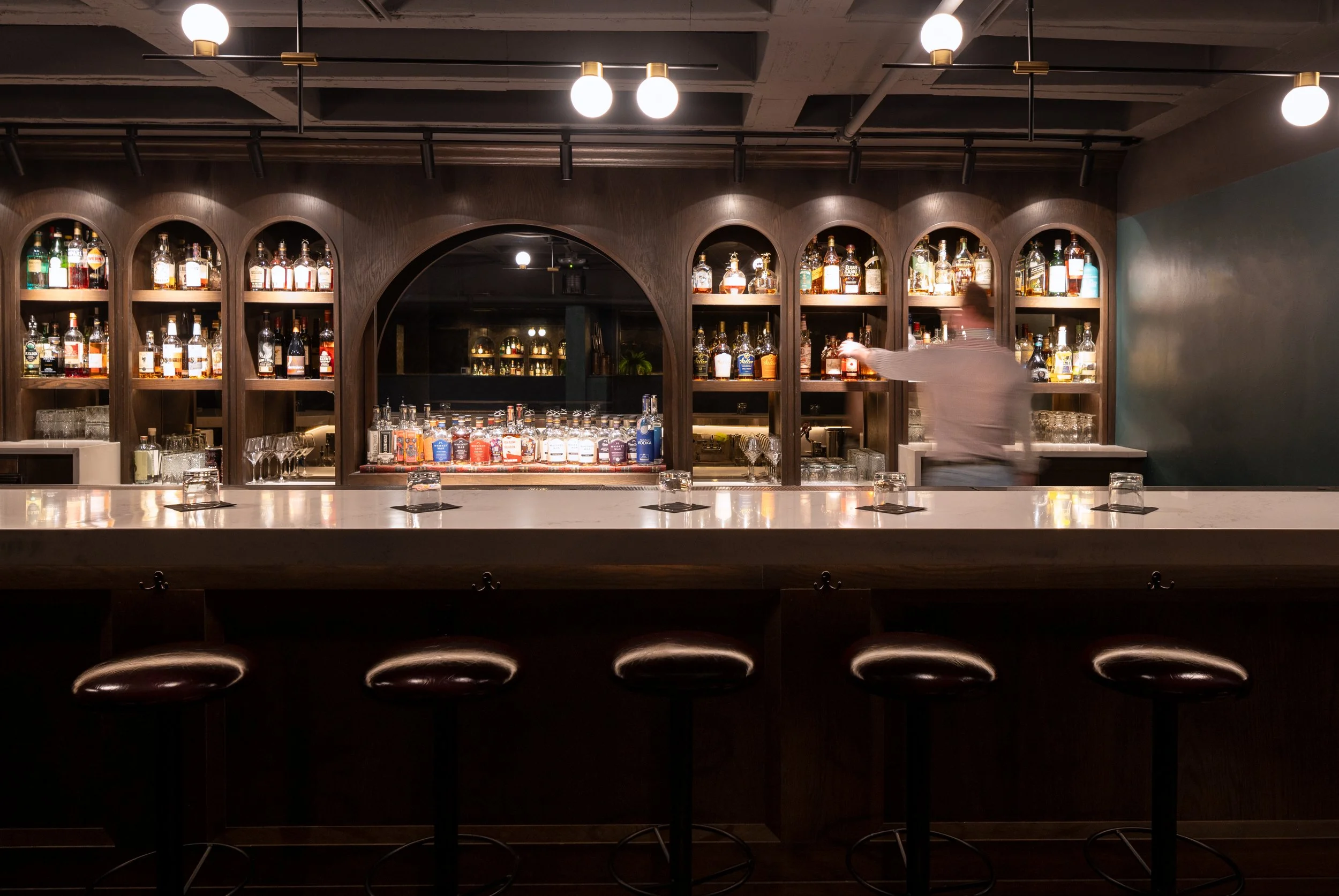 Original architectural features anchor the guest experience. Salvaged teller gates become metalwork behind the host desk. The material palette balances preservation with warmth, introducing elements that complement historic architecture while creating comfortable dining environments.