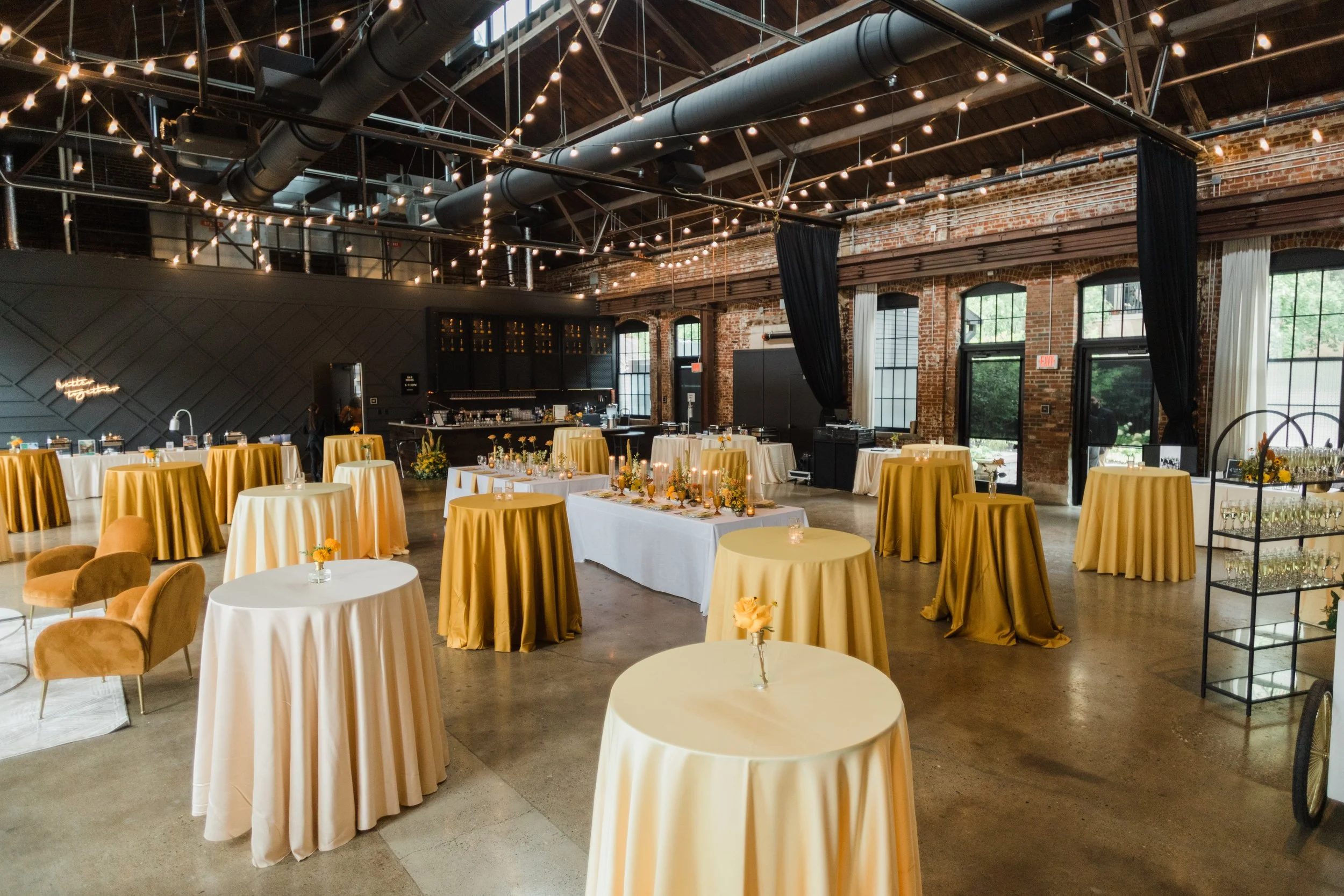The double-height ballroom anchors the venue. An innovative drapery system attached to existing ceiling trusses divides the space into thirds. Hosts create intimate atmospheres for smaller gatherings while preserving grandeur.