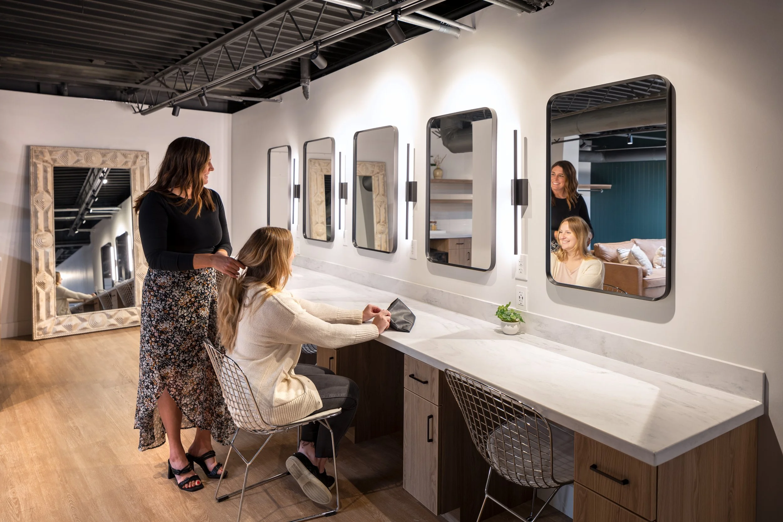 Thoughtfully appointed bridal suite features elegant vanity stations where wedding parties prepare comfortably. Each station incorporates considered lighting, power access, ergonomics enhancing pre-ceremony experience. Adjacent lounge areas provide settings for quiet conversation amid event excitement.