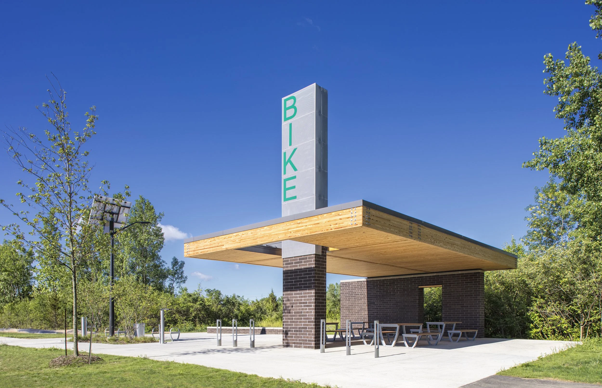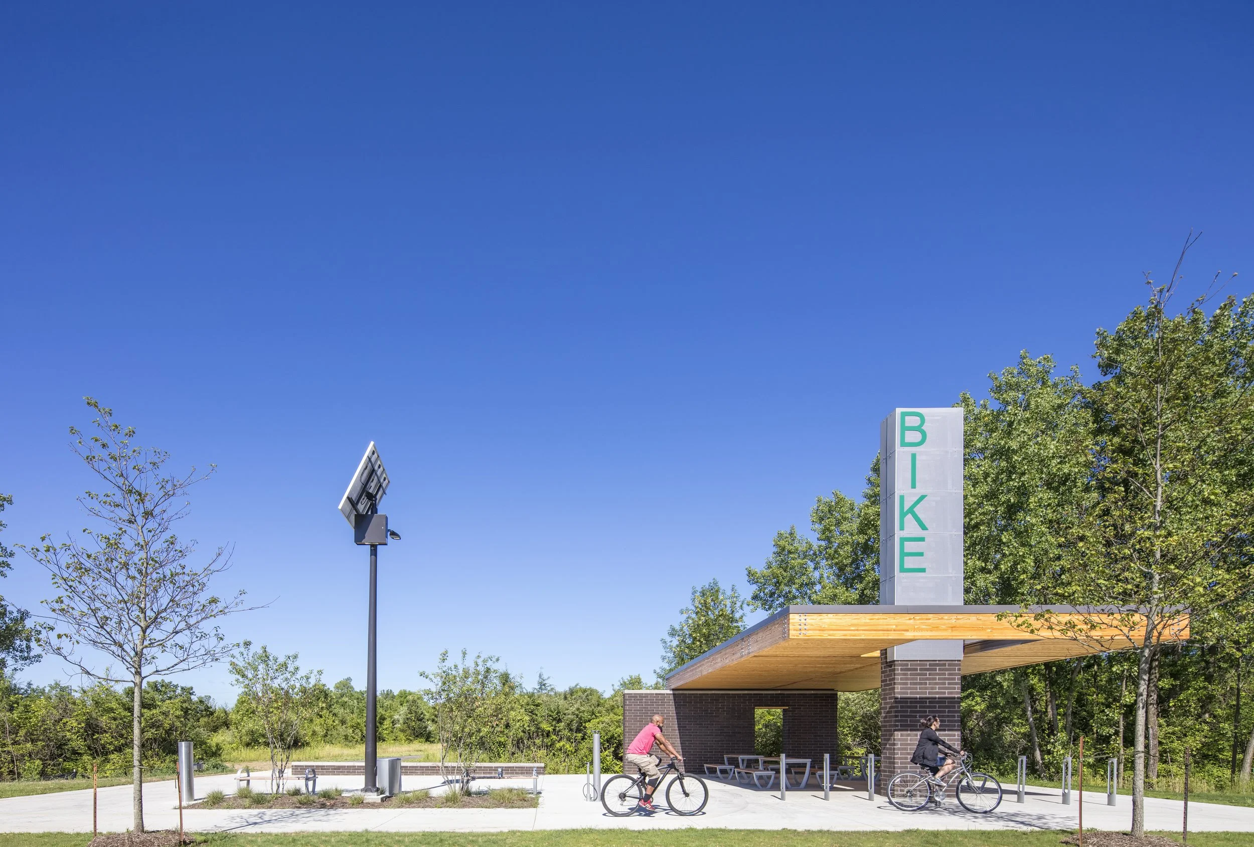 The park's focal point is a striking open-air shelter that provides essential amenities while establishing a distinctive sense of place. Its clean architectural lines create a visual landmark that orients visitors within the 47-acre site while providing necessary shelter for community gatherings and cyclist rest stops. Thoughtfully integrated bike racks and a self-service repair station support the cycling community, while flexible picnic areas invite neighbors to linger and connect.